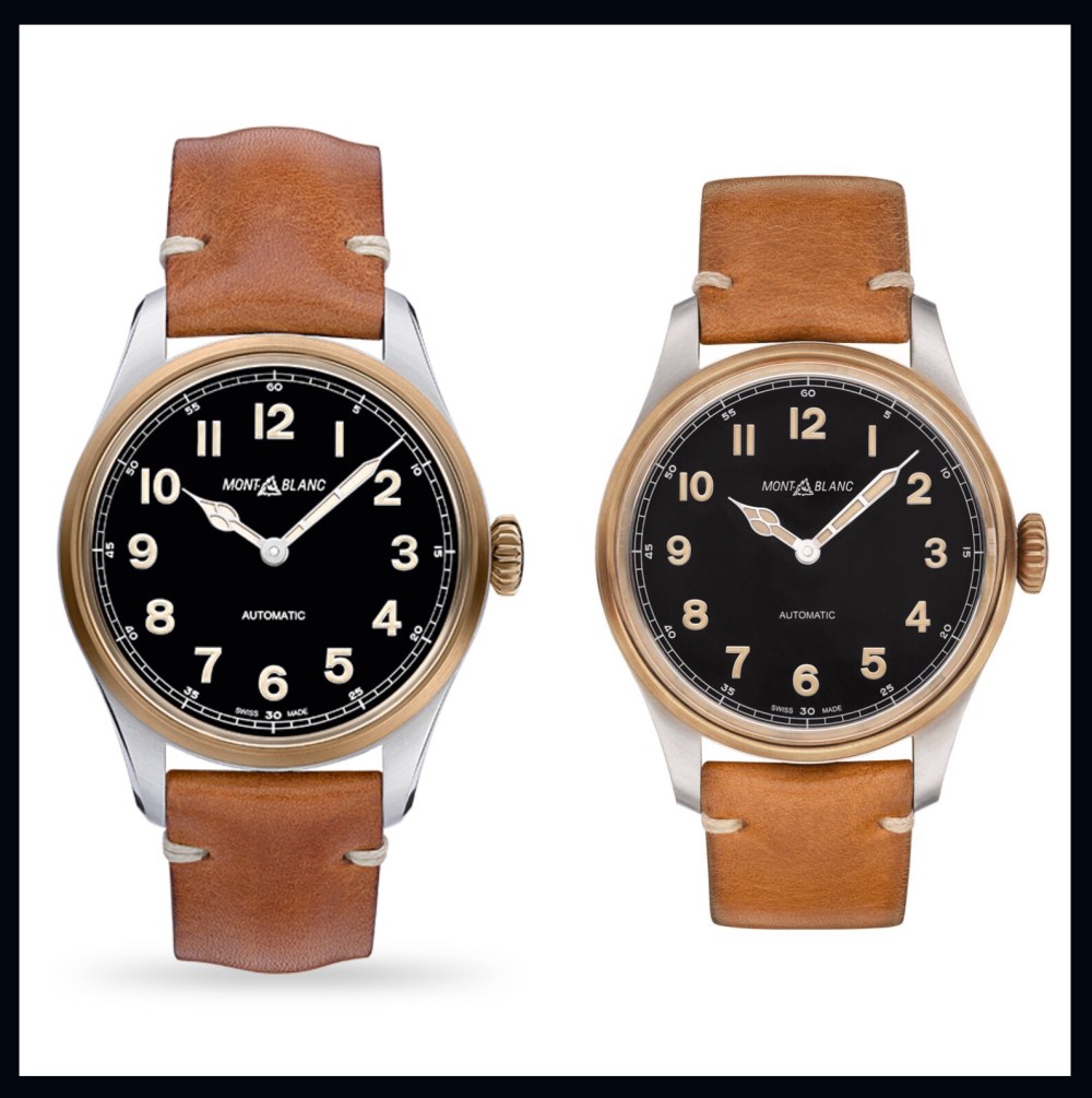 Fort de cette expérience, Montblanc s’amuse pas mal ces dernières années en proposant notamment ce modèle vintage d’une parfaite lisibilité, aiguilles dites « cathédrale », bracelet cuir ou Nato, et cette subtilité supplémentaire présentée dans la photo ci-dessus, un modèle bronze qui diffère finalement assez peu de sa voisine de gauche.