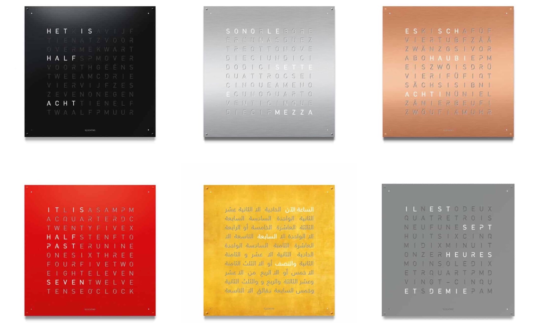 Du modèle de table, format mini 13,5cm x 13,5cm, jusqu’au modèle XXL de 180cmx180cm, la logique reste par contre toujours la même… lire l’heure mais la lire littéralement grâce à la simple apparition de mots.