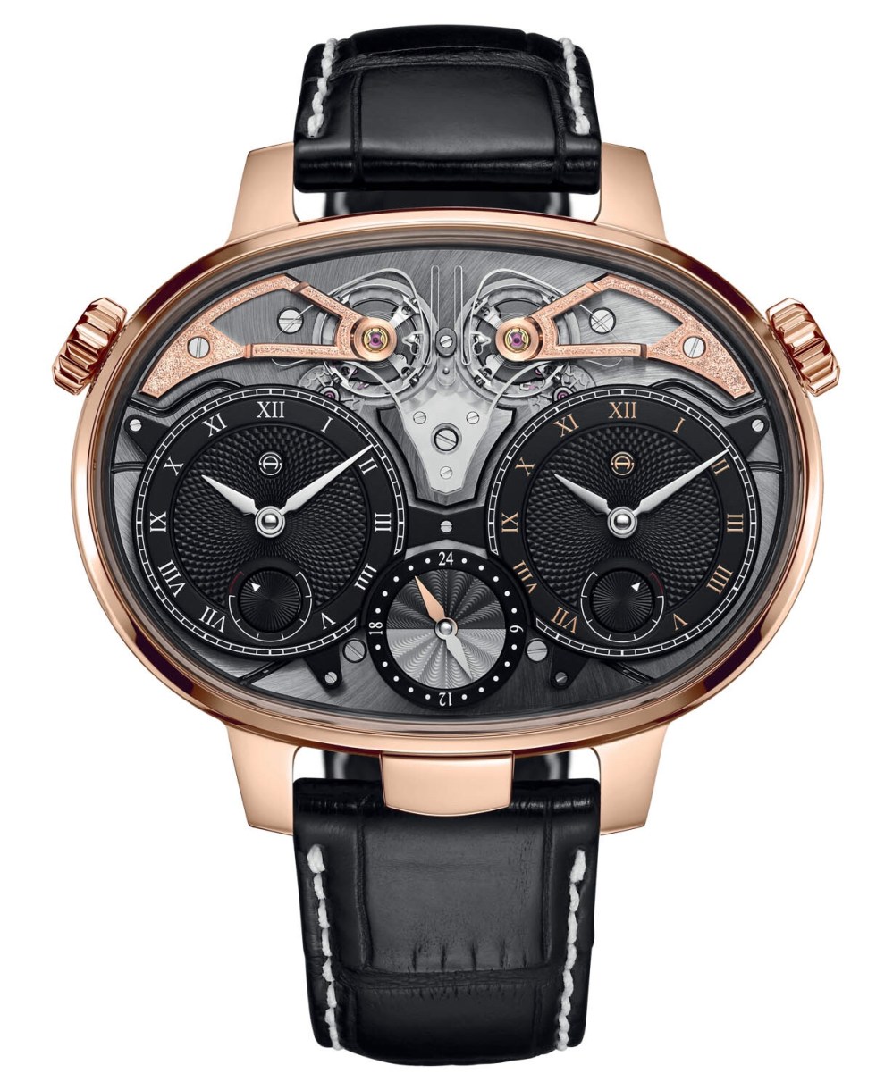Celui-ci renferme 2 mouvements indépendants permettant d’indiquer en plus de l’heure « classique », une heure GMT ou un second fuseau horaire.
