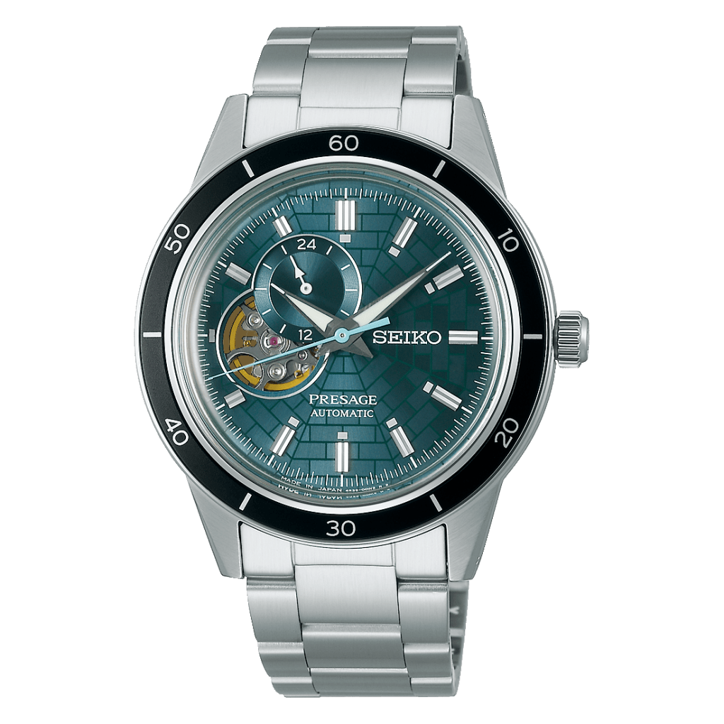 De couleur bleu-gris, les motifs du cadran évoquent l’aspect contemporain des bâtiments et constructions modernes qui délimitent le quartier. L’ouverture à 9h vous laisse voir le battement de l’échappement, le sous-cadran 24h situé juste au-dessus vous permettra de lire l’heure d’une autre manière. Quant à l’aiguille des secondes, celle-ci rend hommage à l’histoire du quartier avec Komparu, une couleur traditionnelle japonaise bleue au ton vert tendre.