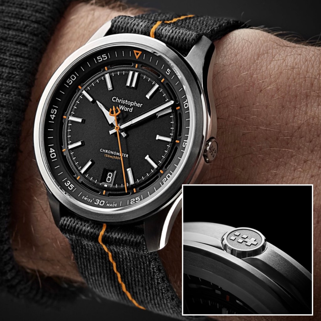 Une couronne rétractable tout d’abord, une première chez Christopher Ward, et une excellente idée par ailleurs puisque lorsque vous porterez cette Elite en montagne ou dans les fonds marins, quel que soit l’effort fourni, celle-ci ne s’enfoncera pas dans votre main.