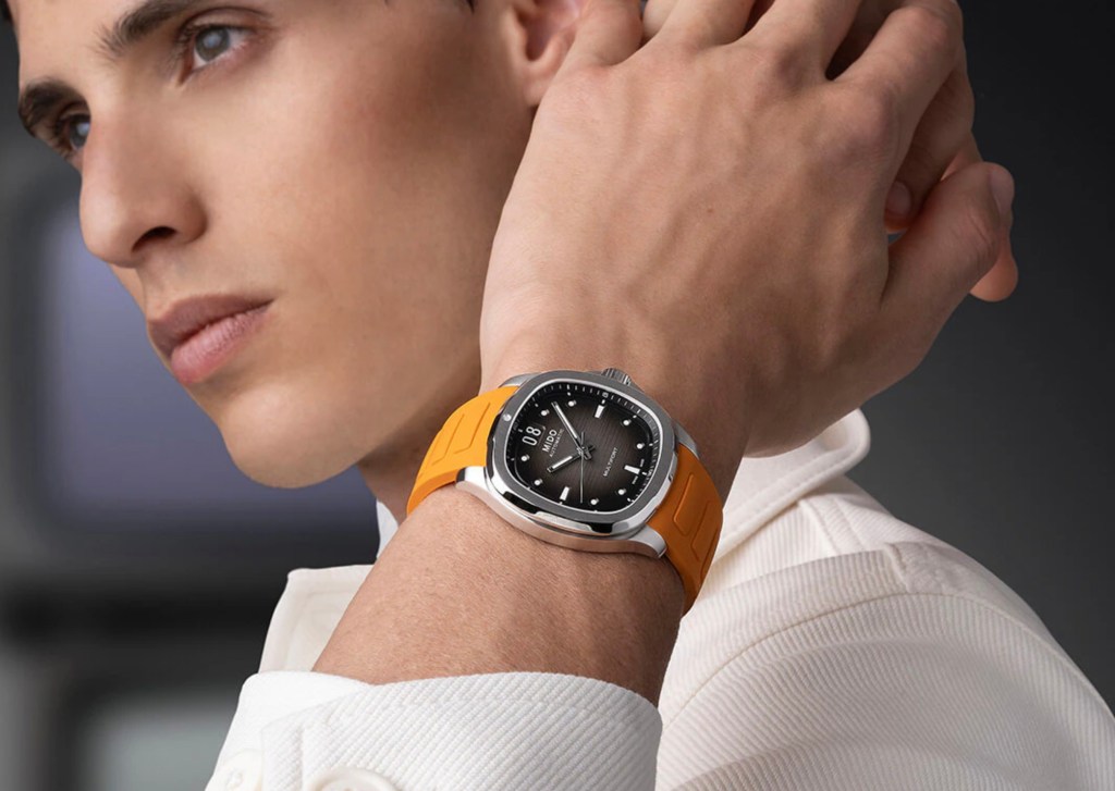 Mais retour un dernier instant à notre Mido, vous observerez qu’à chaque quart, des index trapézoïdaux ont été intégrés et amènent une particularité de plus à cette combinaison. À 12h préside un point sur la lunette qui sert habilement de repère et rappelle les index ronds, historiquement présents dans plusieurs modèles Multifort. En prolongement de cette lunette raffinée, le bracelet et ses mailons centraux polis apporte une élégante rondeur à la montre. À moins qu’un bracelet caoutchouc ne vous sied-il ? Bien évidemment en version orange, difficile de ne pas penser à la célèbre Aquanaut de la maison Patek !