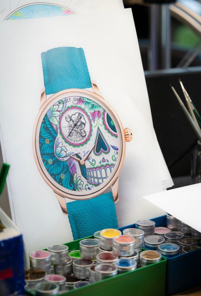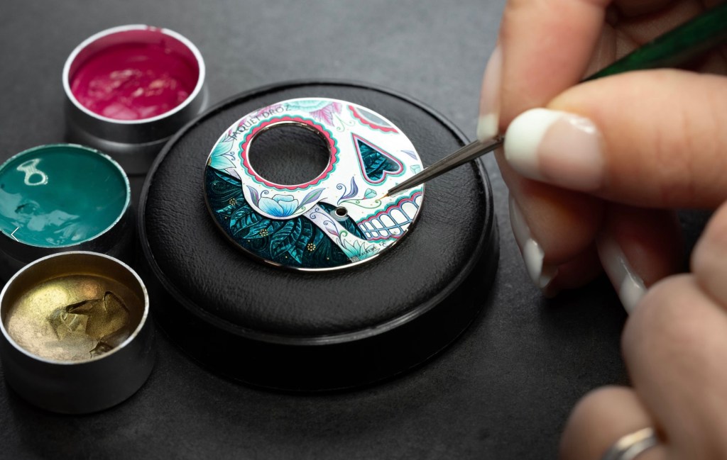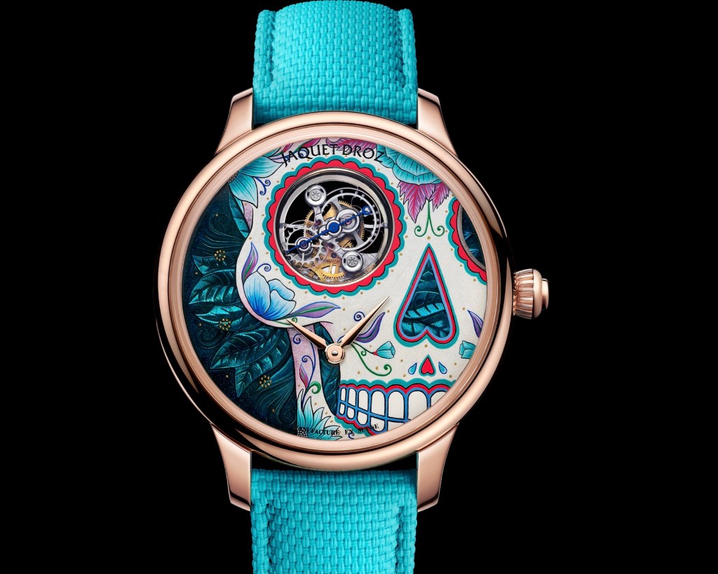 En s’éloignant des clichés masculins du skull traditionnel, Jaquet Droz propose une vision néo-romantique de la calavera mexicaine à travers cette Catrina, exprimant une forme d’impertinence artistique assumée.
