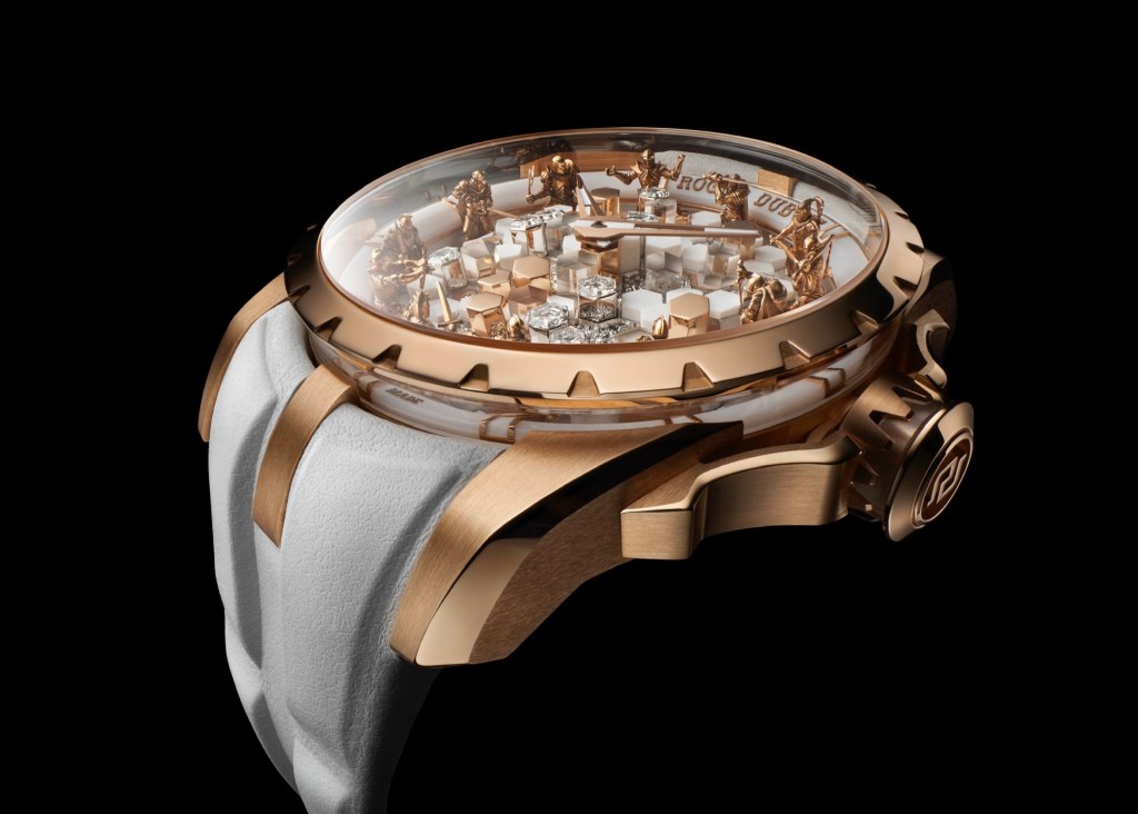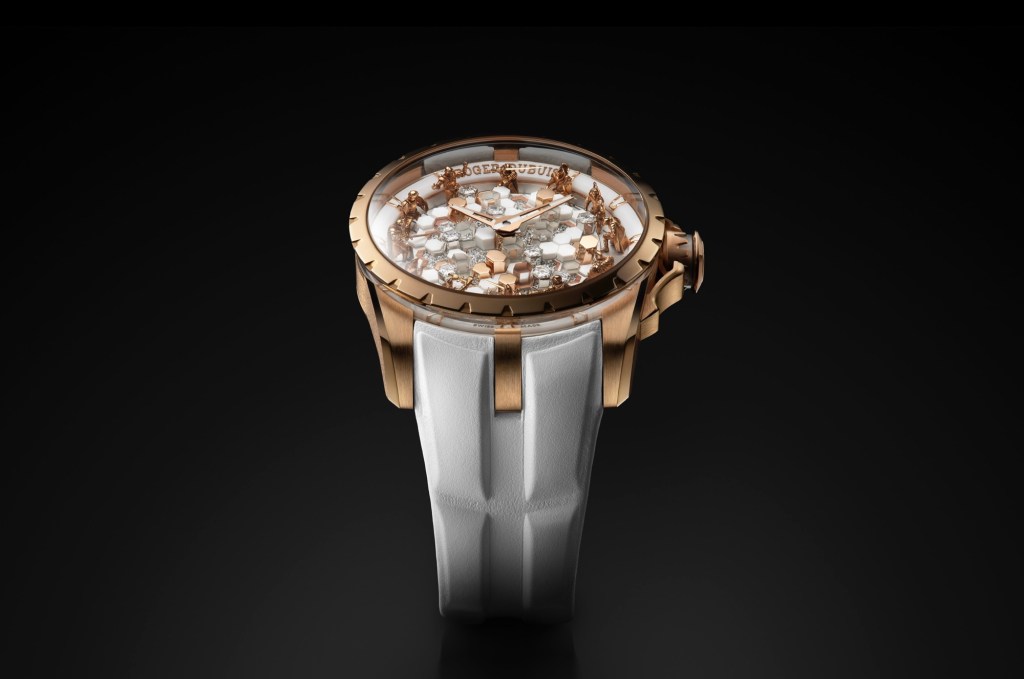 Clin d’œil au palais légendaire de Merlin, le cadran de cette nouvelle pièce évoque une table ronde futuriste, faite de cavités et de sections hexagonales. Une œuvre architecturale miniature, composée de 56 colonnes, parmi lesquelles :